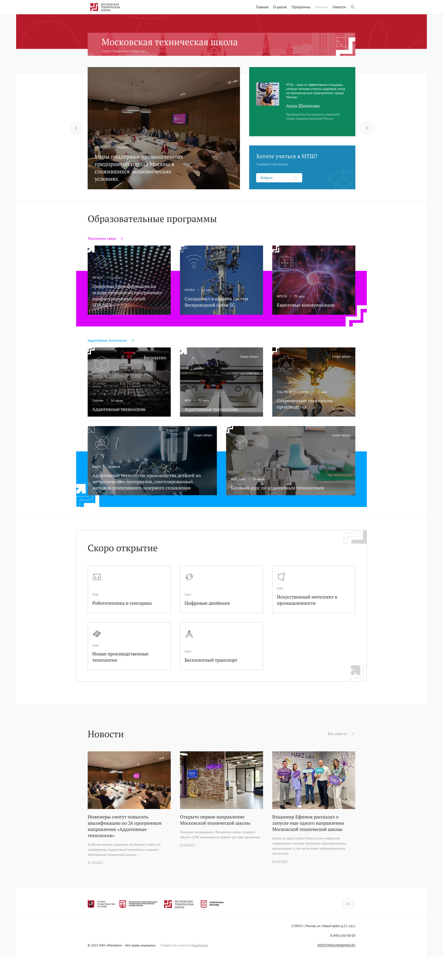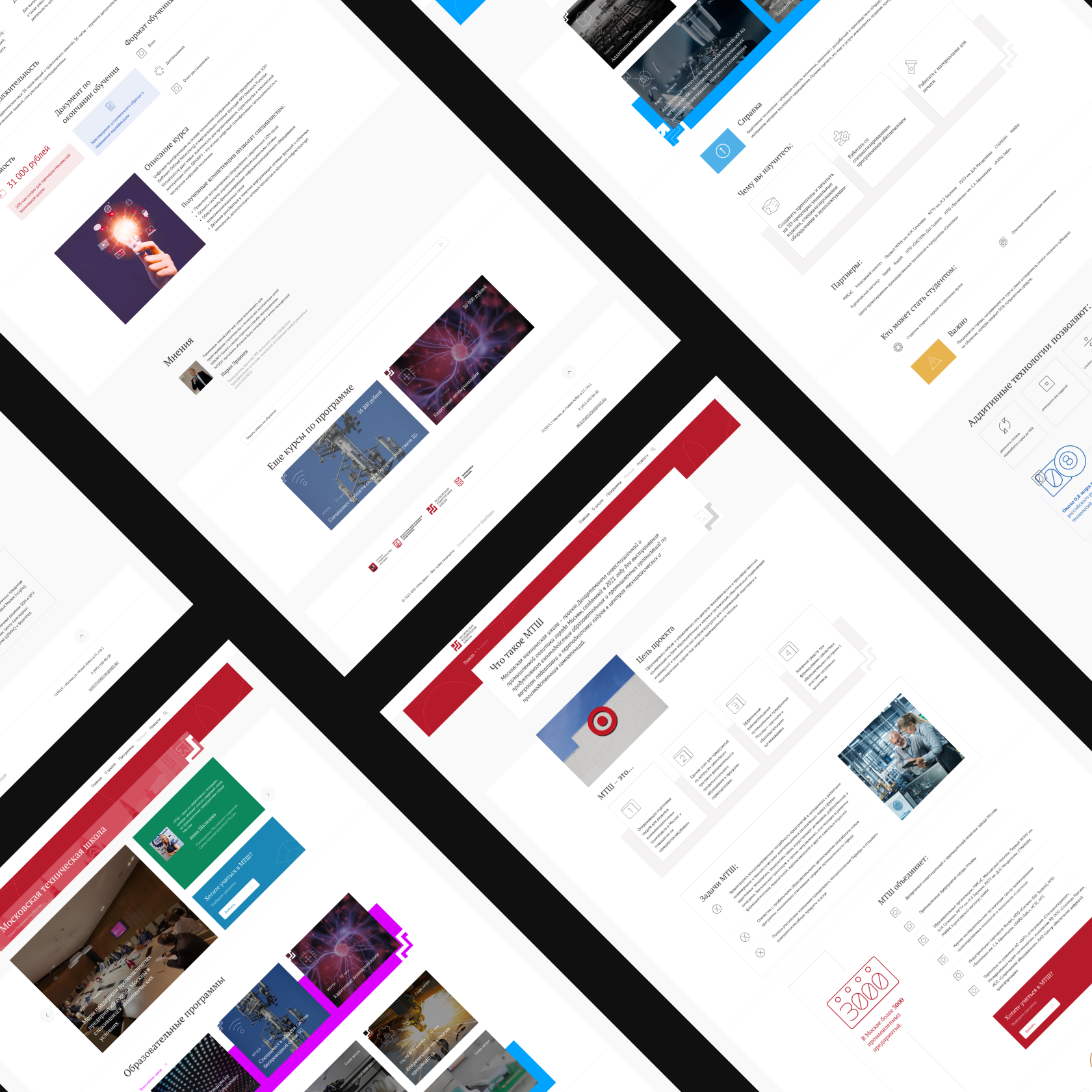 Прежде чем приступить к работе, изучили аналогичные образовательные проекты. За основу дизайн-концепции взяли идею прототипа, своеобразного чертежа с пунктирными линиями, контурной графикой и прочими атрибутами проектной документации. Для создания акцентов добавили яркие цвета: малиновый, голубой, светло-зеленый, изумрудный, кирпично-красный и охристый. По просьбе клиента интегрировали в макет фотографии, которые использовали в качестве подложек для карточек курсов.